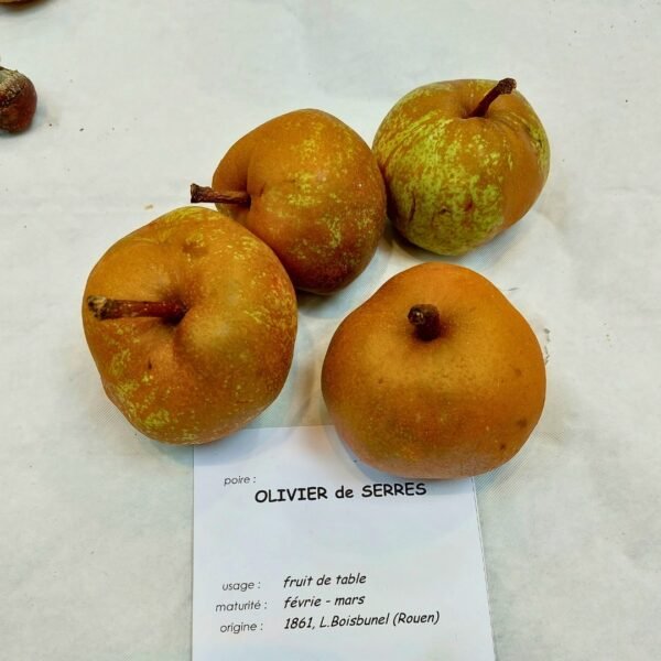 The Olivier de Serres pear tree is a prestigious old variety obtained around 1847 by Mr. Boisbunel, a horticulturist in Rouen, from a seedling of the Fortunรฉ pear of Angers. Described for the first time in 1861, this exceptional pear bears the name of Olivier de Serres (1539-1619), the Ardรจche man nicknamed the “Father of French agronomy”.